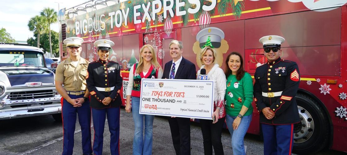 Tropical Financial Credit Union partnered with WPLG-TV Local 10 in Miami and Fort Lauderdale to help make the holidays brighter for thousands of children across South Florida. On December 12, the credit union donated hundreds of toys and a $1,000 contribution as part of the station’s annual Big Bus Toy Express, which collects new, unwrapped toys for the U.S. Marine Corps Reserve’s Toys for Tots program.