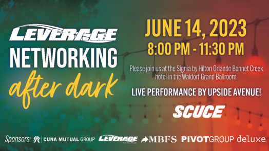 Kickoff Southeast Credit Union Conference & Expo (SCUCE) in style at LEVERAGE’s welcome party on Wednesday, June 14, 2023 from 8:00 – 11:30 p.m.! Come network, enjoy a few cocktails, and listen to a fabulous live band, Upside Avenue, at the...
